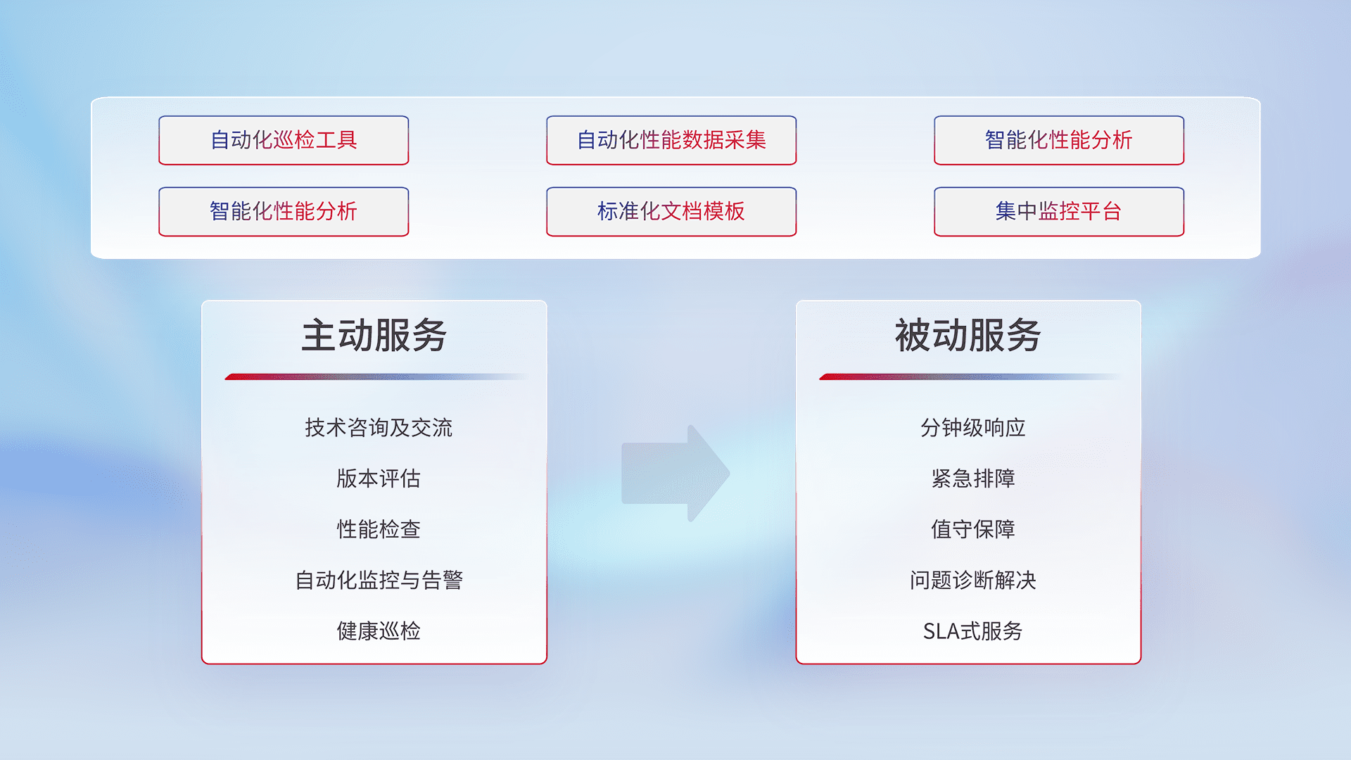 智能化工具和标准化文档,,保障服务质量,,,,提供主动服务(包含技术咨询、、、、版本评估、、、性能检查、、、自动化监控与告警、、、健康巡检)和被动服务包含(分钟级响应、、紧急排障、、、、值守保障、、、问题诊断解决、、SLA服务)。。。