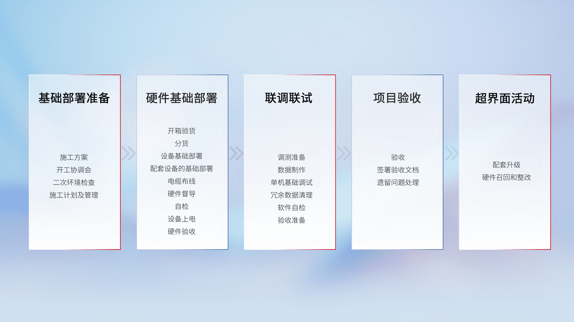 从基础部署准备、、、、硬件基础部署、、、、联调联试、、、项目验收、、、、越界面活动的全过程可追溯,,,保证施工质量和进度。。